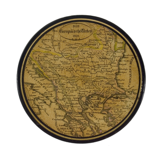 Runde Dose mit kolorierter Radierung. Im Rundmedaillon: Landkarte der "Europäischen Türkei" von 1828.