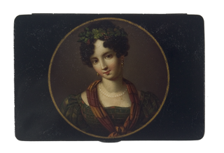 Rechteckige Dose mit einer allegorischen Darstellung des Herbstes. Junge Schönheit mit kariertem Kleid, Weinlaub und Trauben im Haar, Ohrgehängen, Perlenkette und gebundenem Halstuch. Leicht verlaufender, dunkler Hintergrund. Malerei des Herbstes (L´Automne) nach dem allegorischen Jahreszeiten-Zyklus "Le Printemps, L´Ete, L´Automne, L´Hiver" nach französischen Kupferstichen von Pioline (Lebensdaten unbekannt) nach Alexandre Maria Colin (1798-1875).