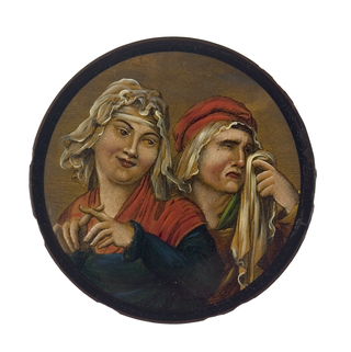 Runde Dose mit übermalter Radierung. Bildnisse zweier, bäuerlicher Frauen mit Kopfhauben. Die Weinende, sich die Tränen mit großem Tuch abwischend, wird von der anderen durch ein Fingerspiel verhöhnt. Darstellung vermutlich nach bzw. im Stil des Louis-Léopold Boilly (1761-1845).