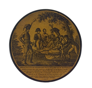 Runde Dose mit einer Radierung auf Goldgrund. Napoleon besucht den verwundeten Grafen Lannes von Montebello auf dem Krankenlager im Freien. Um sie herum eine Privatperson sowie französische Soldaten. In einer Lunette am unteren Bildrand: Erklärender Text in französischer Sprache.
