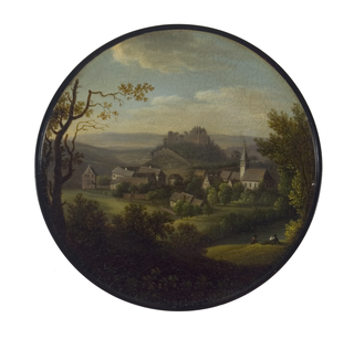 Runde Dose mit einer Landschaftsdarstellung. Blick auf Badenweiler. Im Vordergrund Wiesen, Büsche und Bäume sowie Fluß und zwei Personen. In der Bildmitte die Ortschaft Badenweiler sowie Berg mit Schlossruine. Im Hintergrund sanfte Hügel.