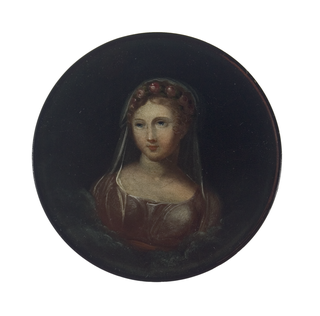 Runde Dose mit junger Frau mit Rosenkranz im Haar und Schleier. Dunkler Hintergrund. Anmerkung: Die Signatur "St.ur" bezieht sich mit großer Wahrscheinlichkeit auf die Manufaktur Evers.