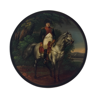 Runde Dose, Deckel und Boden ursprünglich nicht zusammengehörig. Der ehemalige Feldherr und französische Kaiser Napoleon in Uniform hoch zu Roß am Wald. Rechts Blick in eine Landschaft in der Abenddämmerung.