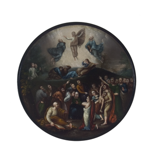 Runde Dose mit vielfiguriger Darstellung der Himmelfahrt Christi. Malerei nach der Stichvorlage "La Transfiguration de Jesus-Christ" von Raffaelo Santi, genannt Raffael (1483-1520).