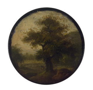 Runde Dose mit gerader Wandung. Vorharzlandschaft mit mächtigem Eichbaum im Vordergrund. Hinter diesem Berg- Wiesen- und Flußlandschaft mit Personenstaffage. Malerei im Stil des Pascha Johann Friedrich Weitsch (1723-1803). Anmerkung: Dosen mit gerader Wandung deuten auf eine Herstellung durch die Manufaktur Stobwasser vom Ende des 18. Jahrhunderts .