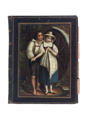Rechteckiges Schreibetui aus Leder. Auf der Deckplatte eingesetzte Weißblech-Bildplatte mit jungem Paar in bäuerlicher Tracht vor einem Mühlrad. Am Boden Blumen und Pflanzen.