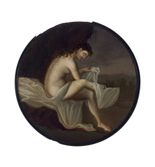 Runde Dose mit der unbekleideten Göttin Venus mit geöffnetem Haar und üppigen Tüchern nach dem Bad im Freien. Landschaftshintergrund.