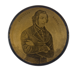 Runde Dose mit einer Umdruck-Radierung auf goldfarbenem Grund. Bildnis des Mitbegründers der "Deutsch-Katholischen- Kirche" Johannes Ronge (1813-1887), Pfarrer der Christlichen Gemeinde Breslaus. Rückseitig, ebenfalls auf Goldgrund: Zehnstrophiges Gedicht Ronges. Anmerkung: Ronge wurde wegen seiner offenen Angriffe auf das Papsttum 1843 suspendiert, 1844 exkommuniziert und lebte daraufhin als politischer Flüchtling in England.