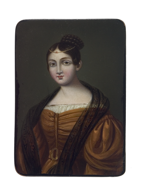 Junge Frau mit Hochsteckfrisur mit gewundenem Zopf und goldener Stirnkette mit Rubin, Festtagskleid mit voluminösen Puffärmeln, weißer, gefältelter Bluse sowie schwarzem Spitzenschleier.