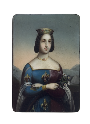 Rechteckige Dose mit junger Orientalin mit Flechtfrisur, Krone, Festkleid mit bourbonischen Lilien sowie doppelreihiger Kette, Stola und Margerithen in der Hand. Im Hintergrund Palmen, Zelt und Berge.