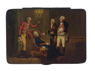 Rechteckige Dose mit Friedrich dem Großen auf dem Sterbelager. Der sieche König Friedrich II.. (1712-1786) mit Uniform, auf einer Recamiere liegend, empfängt, begleitet von zwei weiteren Persönlichkeiten (einer von ihnen mit dreiflammigem Kandelaber, der andere mit dem Zweispitz des Königs), den Thronfolger Friedrich Wilhelm II. (1744-1797) mit einem Schlüsselbund in der Rechten in Schloß Sancoussi.
