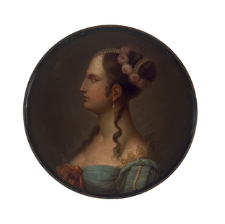 Runde Dose mit junger Frau in Profilansicht mit Perlbändern und Rosen im Haar, üppiger Schleife am Dekolletée und Spitzenbordüre am Kleiderärmel. Verlaufender, einfarbiger Hintergrund.