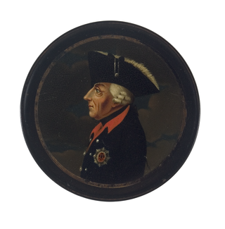 Runde Dose, schwarz lackiert. In schmalem, goldfarben umrahmtem Rundmedaillon: Friedrich II. (der Große) im Profil. In Uniform mit Zweispitz mit Federn und schwarzem-Adler-Orden. Dunkler, neutraler Hintergrund.