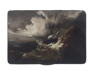 Rechteckige Dose mit bei stürmischer See gegen die Wellen kämpfenden Segelschiffen. Dunkler, dramatisch beleuchteter Himmel mit fliegenden Vögeln. Malerei nach einer Vorlage von Claude-Joseph Vernet (1714-1789).