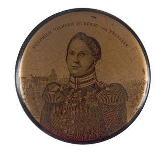 Runde Dose mit Radierung auf Goldgrund. Bildnis des Preussenkönigs Friedrich Wilhelm IV. (1795-1861, reg. 1840-1861) in Uniform mit verschiedenen Orden sowie Epauletten. Im Hintergrund Schloß Sancoussi von der Gartenseite.