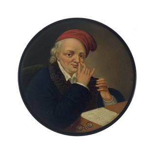 Runde Dose mit Bildnis eines mittelalten Herrn mit Mütze und Schnupftabaksdose beim Tabakschnupfen am Tisch, auf dem ein Schriftstück sowie eine Brille liegen. Verlaufender, einfarbiger Hintergrund.