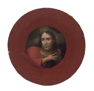Runder, herausgetrennter Schnupftabaksdosendeckel einer ehemaligen Dose, dunkelrot lackiert. Im Mittelmedaillon: Das Kreuz tragender Christus mit Strahlenkranz.