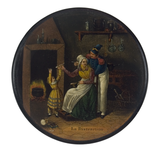 Runde, ungewöhnlich hohe Dose mit kolorierter, bzw. übermalter Radierung. Interieurszene. Junger, französischer Soldat macht einer jungen, volkstümlich gekleideten Frau, die ihr Kind vor dem brennenden Kamin füttert, Avancen. Im Hintergrund diverse Küchenutensilien. Unter der Darstellung bezeichnet: "La Distraction."
