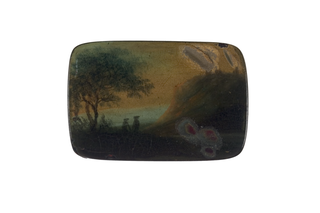 Rechteckige Spiele-Jeton-Dose (vermutlich aus einem Vierersatz) mit einfacher Malerei. Landschaft mit Berg, Baum, See sowie zwei Wanderern.