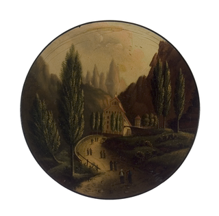 Runde Dose (ohne Randwulst). Düstere Berglandschaft mit hohen Espen und breitem Weg mit Personenstaffage. Im Zentrum eine Klosterkirche.