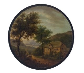 Runder Dosendeckel einer ehemaligen Schnupftabaksdose. Blick in eine Berg- und Flußlandschaft. Im Vordergrund Bäume und Weg mit Personenstaffage. Rechts ein kleineres Bauernhaus, die Emmelinenhütte vor dem Kirschberg in der Nähe von Darmstadt. Wolkiger Himmel.