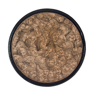 Runde Dose mit koloriertem Umdruckdekor. Zahlreiche, ineinander verschlungene, Grimassen schneidende Gesichter. Anmerkung: Mit "Stobwasser" signierte Dosen mit Umdruckdekor sind außerordentlich selten.