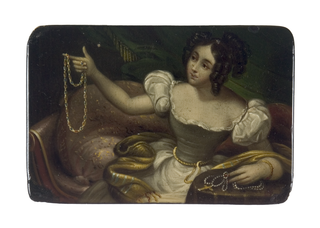 Rechteckige Dose mit junger, auf dem Sofa sitzender Frau im Biedermeierkleid, die mit ihrem Schmuck kokettiert. Hinter ihr geraffter Vorhang mit Fransenbordüre.