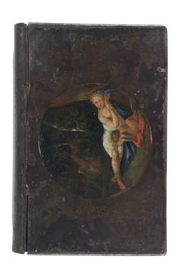 Rechteckige Dose in Buchform. In schmal gerahmtem Rundmedaillon: Waldlandschaft mit ruhender Venus mit vor ihr schlummerndem, unbekleideten Amorknaben. Anmerkung: Dosen in Buchform sind sehr selten.