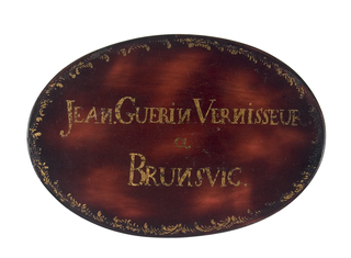 Ovale Dose mit Schildpattimitation. Umlaufender Floralfries in Goldlack. Im Zentrum Bezeichnung (s. o.). Anmerkung: Besitzer der Dose war Jean Guérin, der Schwiegersohn Johann Heinrich Stobwassers.