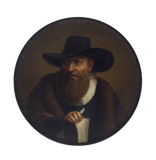 Runde Dose mit dem Bildnis eines unbekannten, niederländischen Ratsherrn mit Bart, großem Hut, Faltenkragen, Pelzkragen, Schreibfeder und Buch. Malerei nach einer Vorlage von Rembrandt Harmensz van Rijn (1606-1669).