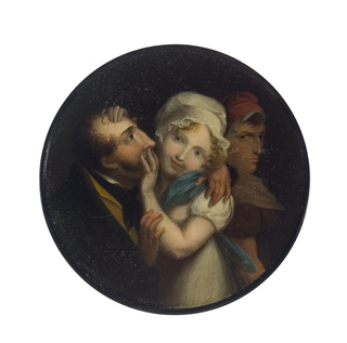 Runde Dose mit jungem Mann mit Backenbart, der eine junge, sich wehrende Frau mit Haube und Halstuch bedrängt. Im Hintergrund eine ernst blickende, weitere Frau mit Haube. Dunkler, neutraler Hintergrund. Malerei nach einer Vorlage von Louis Léopold Boilly (1761-1845).