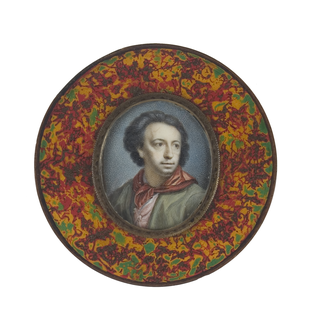 Runde Dose, rundum mehrfarbig gesprenkelt und marmoriert (mit eingelegten Metallfäden). In den Deckel eingelegte, mit vergoldetem Metallrahmen umgebene, mit Glas abgedeckte Ovalminiatur auf Elfenbein. Bildnis des Malers Anton Raphael Mengs (1728-1779) in Gouache. Malerei nach dem Selbstporträt von Mengs. Anmerkung: Im Innern der Dose ein Schriftstück, nach welchem die Dose angeblich für einen "Klaviervirtuosen Brucka" gefertigt wurde. Anmerkung: Stobwasserdosen dieser Art sind außerordentlich selten.