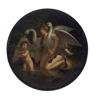 Runde Dose mit der von zwei Schwänen begleiteten, unbekleideten, am Ufer knieenden Leda, die von Amor ins Bad geleitet wird. Im Hintergrund Laubwerk. Malerei nach einer Vorlage von Francesco Albani (1578-1660).