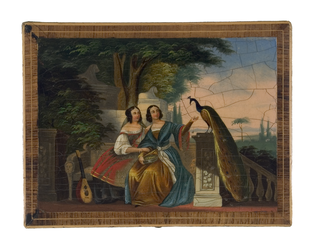 Rechteckiges Nessecaire mit Pflegeutensilien im Innern. Holzkorpus mit übermalter Radierung. Zwei auf einer Steinbank sitzende junge Frauen in Biedermeierkleidung beim Füttern eines Pfaus, der auf einem Pfeiler steht. Im Hintergrund Monument mit liegenden Steinlöwen und romantische Landschaft.