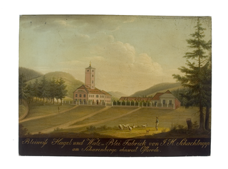 Rechteckige Schatulle mit Darstellung der Fabriksgebäude der "Bleiweiß-, Hagel- und Walzblei- Fabrik Schachtrupp" am Scharenberg in der Nähe von Osterode am Harz. Im Vordergrund Schäfer mit Herde und Hund sowie auf dunklem Sockel Beschriftung in Gold (s. o.)