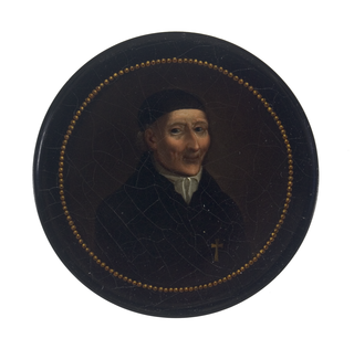 Runde Dose, schwarz lackiert. Im Rundmedaillon in gemaltem Perlfries: August Christian Bartels, Abt von Riddagshausen bei Braunschweig (1781-1868, Abt 1790-1826). Malerei nach einer Lithographie von Friedrich August de la Belle (geb. 1787)