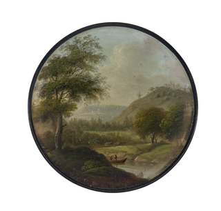 Runde Dose mit einer Ideallandschaft. Im Vordergrund Fels mit großem Baum. Blick auf eine Aue mit Flüßchen mit Fischerboot und größerem Berg mit Bäumen und Büschen. Im Hintergrund kleinere Ansiedlung und Bergkette. Wolkenhimmel.