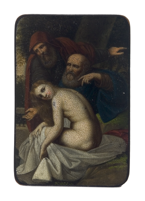 Rechteckige Dose mit Susanna, die beim Baden von zwei alten, bärtigen Männern (den beiden Alten) überrascht wird.