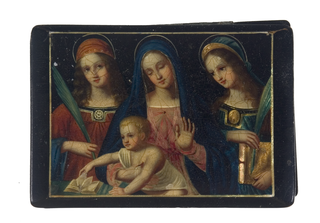 Rechteckige Dose mit eingelegter Perlmuttplatte. Madonna mit Jesuskind, das in einem Buch blättert, flankiert von zwei Engeln mit Heiligenschein, Palmwedeln und Buch. Anmerkung: Dosen mit eingearbeiteten Perlmuttplatten entstammen in erster Linie den russischen Lackmanufakturen.