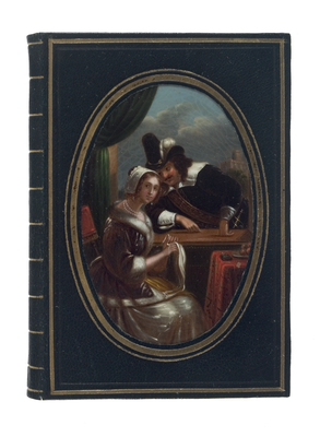 Notizbüchlein aus Leder mit eingelegter Papiermaché-Platte. Der Flirt am Fenster. Junge Frau bei der Handarbeit mit einem Verehrer mit Federhut am geöffnetem Fenster. Im Hintergrund ein Haus mit Turm. Malerei nach einer Vorlage von Caspar Netscher (1639-1684).