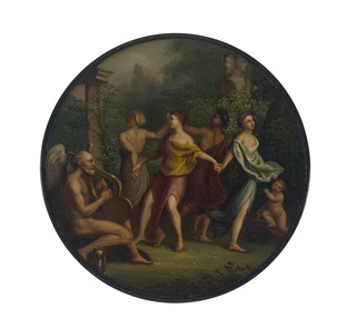 Runde Dose mit Kronos, dem Gott der Zeit, der mit der Laute drei Nymphen und einem jungem Bacchanten im Wald zum Tanz aufspielt. Am rechten Bildrand dem Treiben zusehender Amorknabe. Im Vordergrund eine rieselnde Sanduhr; im Hintergrund doppelköpfige Herme.