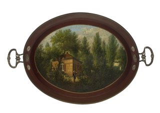 Ovales Tablett, braun lackiert. Griffe, Applikationen und Randeinfassung aus vergoldetem Metall. Im Spiel in goldfarben gerahmtem Ovalmedaillon: Braunschweiger Parkanlage mit Haus (sog. "Schiefer Ständer") sowie Pavillon mit Personenstaffage.