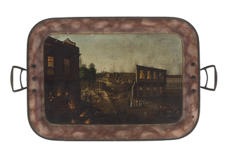 Rechteckiges Tablett mit abgerundeten Ecken. Handhaben, Nieten und Randeinfassung aus vergoldetem Metall. Fahne in Schildkrotart, Boden schwarz lackiert. Im Spiegel: Schloßplatz mit zahlreichen Personen und Ruine des ausgebrannten Braunschweiger Schlosses im September 1830.