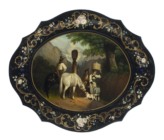 Ovalförmiges Tablett mit geschwungenem Rand (gotische Form). Fahne und Boden schwarz lackiert. Im Spiegel: Ländliche Bergidylle mit verschiedenen Personen, Pferden und Hund am Brunnen. Fahne mit goldfarbenen Arabesken und Blumen dekoriert.