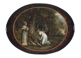 Großes Tablett mit ausgesparten Handhaben im schwarz lackierten Tablettrand. Boden ebenfalls schwarz. Spiegel mit Schildpattimitation. In mit schmalem Goldrand verzierten Ovalmedaillon: Labung eines erschöpften alten Reisenden unter großem Eichbaum durch zwei junge Frauen in Kleidern der Empire-Zeit. Im Hintergrund zweispännige Kutsche mit rastendem Kutscher auf dem Kutschbock am Waldweg. Malerei vermutlich von Friedrich Georg Weitsch (1758-1828). Anmerkung: Dieses Tablett diente ehemals vermutlich als Aufsatz für einen Serviertisch. Hierfür spricht nicht zuletzt der gerade Tablettrand.