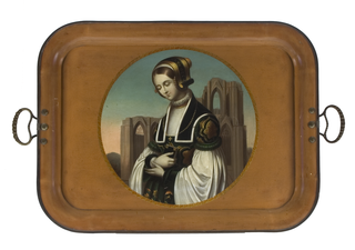 Rechteckiges Tablett mit abgerundeten Ecken. Griffe, Nieten und Randeinfassung aus vergoldetem Metall. Spiegel und Fahne hellbraun, Rückseite schwarz lackiert. In gold-bräunlich gerahmtem Rundmedaillon: Junge Kirchgängerin mit Gebetbuch, Haube und Festkleid im gotischen Stil vor dem unvollendeten Kölner Dom. Malerei nach der Lithographie "Die Kirchgängerin" von P. Avanzo (Lebensdaten unbekannt) nach einem Gemälde von Louis Emy Blanc (1810-1885). Anmerkung: Das Originalgemälde befindet sich im Rheinischen Landesmuseum in Bonn, eine eigenhändige Replik in der Landesgalerie Hannover.