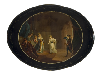 Ovales Tablett, schwarz lackiert. Ausgesparte Handhaben im Rand. Im Spiegel in einem mit schmaler Linie und gemalten Perlen gerahmtem Ovalmedaillon: Interieurszene am Königshof (vermutlich eine Szene aus "King Lear" von William Shakespeare). Auf einem Thron sitzender König mit drei jungen Frauen (seine drei Töchter?) und weiteren Personen in einem steinernen Gewölbe.
