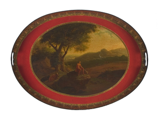 Ovales Tablett, rot lackiert. Unterseite und Außenrand schwarz lackiert. Im mit Goldfarbe ornamentierten Tablettinnenrand ausgesparte Handhaben. Im mit goldfarben gerahmten Ovalmedaillon: Arkadische Landschaft mit unbekleidetem, auf einer Felsbank sitzenden Jüngling sowie unter großen Bäumen ruhenden Rindern. Hintergrund mit Bergen und einer in der Ferne liegenden Ansiedlung. Malerei vermutlich von Friedrich Georg Weitsch (1758-1828). Anmerkung: Die Malereizuschreibung erfolgte durch den Weitsch-Experten Reimar Lacher.