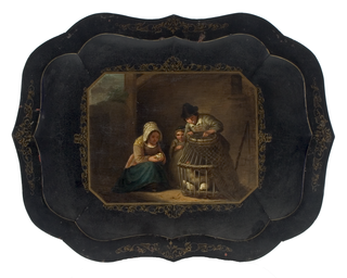 Rechteckiges Tablett mit gewelltem Rand (gotische Form), schwarz lackiert. Tablettrand mit Goldornamenten. Im Spiegel eine mit Goldornamenten umgebene Achteckreserve mit einem Geflügelhändler mit einem Käfig mit Glucke und Küken, der einer Frau mit Kind vor dem Stall ein Küken übergab.
