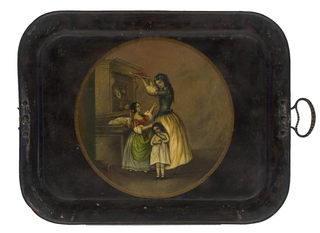 Rechteckiges Tablett mit abgerundeten Ecken, dunkelbraun lackiert. Griff (ein zweites Exemplar fehlt), Nieten und Randeinfassung aus Metall. In einem mit schmalem Goldrand gerahmten Rundmedaillon: Junge Mutter mit zwei Kindern in der Küche, die ein Tablett mit Kirschen auf der Küchenkredenz vor diesen in Sicherheit bringt. Anmerkung: Auf der Unterseite Papieraufkleber: "W.F. AHRT in HAMBURG Neuerwall 30."